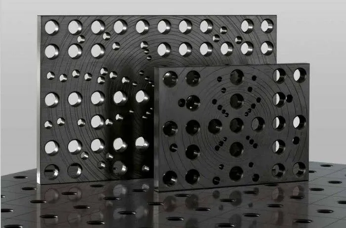 Трубы, имеющие фланцевый элемент стандарта DIN, закрепляются на сварочном столе с помощью универсальной детали – специальной крепежной плиты с отверстиями, расположенными по кругу. На одной плите можно закрепить фланцевые оконечности труб различного диаметра на 2 фиксирующих болта как в рамках 16, так и в рамках 28 системы. Плита выполнена из стали с азотированием.