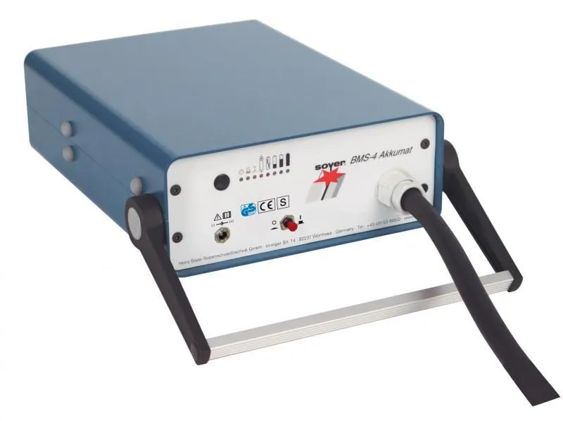 Блок питания BMS-4 Akkumat сконструирован и предназначен для одновременной приварки двух метизов. Два метиза M3 могут одновременно свариваться без заземляющего подсоединения, например, чтобы крепить температурные датчики (счетчики) на батареях и теплообменниках. Предусмотрена возможность выборочно настроить расстояние между метизами. Работа от аккумулятора позволяет работать в местах, где нет электричества.