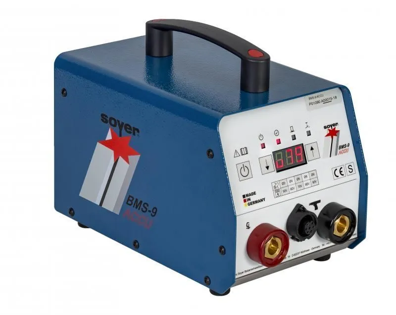 Блок питания BMS-9 - новейшая разработка,работающая на аккумуляторах, собравшая в себя все преимущества других конденсаторных блоков: небольшой вес, удобное и понятное управление, индикация о готовности к работе на самом пистолете, более мощные силовые разъемы, пистолет с подъемом, компактные внешние размеры. Лучший аппарат на рынке. Для работы необходимо подключение электричества 220 В. Защитный газ и иные средства не требуются.