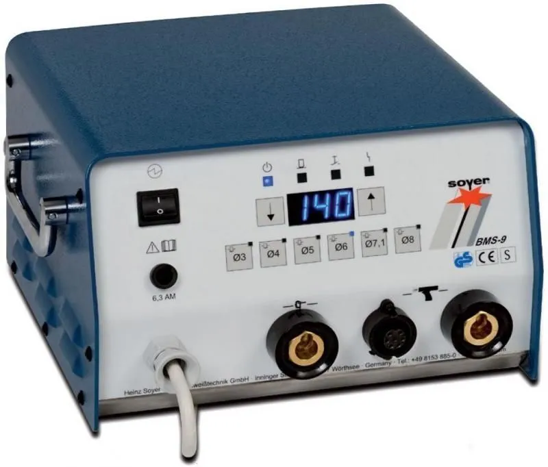 Блок питания BMS-9 - новейшая разработка, собравшая в себя все преимущества других конденсаторных блоков: небольшой вес, удобное и понятное управление, индикация о готовности к работе на самом пистолете, более мощные силовые разъемы, пистолет с подъемом, компактные внешние размеры. Лучший аппарат на рынке. Для работы необходимо подключение электричества 220 В. Защитный газ и иные средства не требуются.