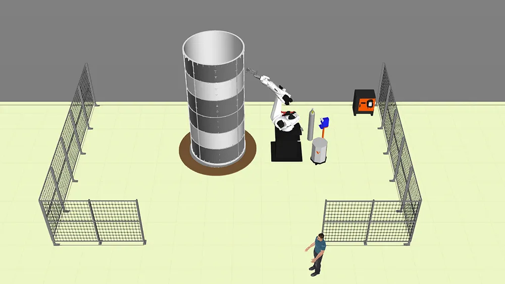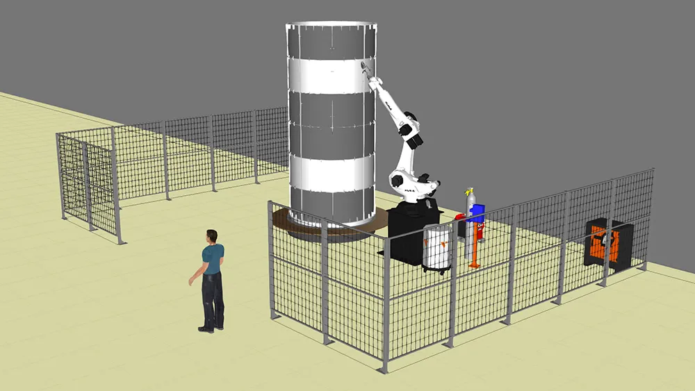 Сварочный комплекс предназначен для сварки частей промышленного дымохода из неержавеющей стали L=4000 мм в вертикальном положении. Для этой задачи был подобран робот с радиусом рабочей зоны 2700 мм, спроектирована тумба под робот высотой 1000 мм, что позволяет производить сварку по всей высоте изделия.