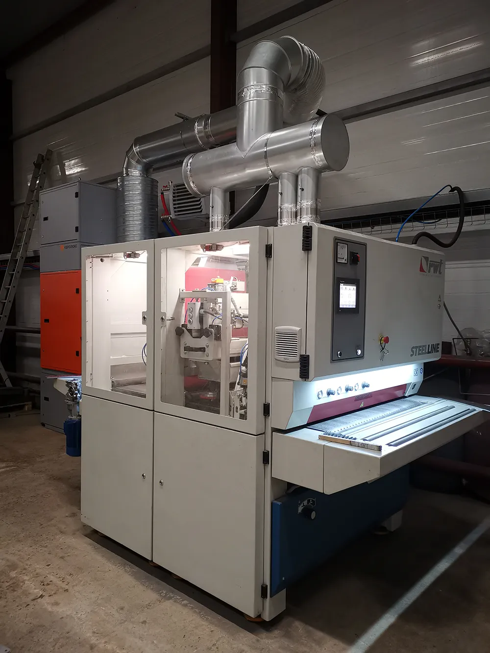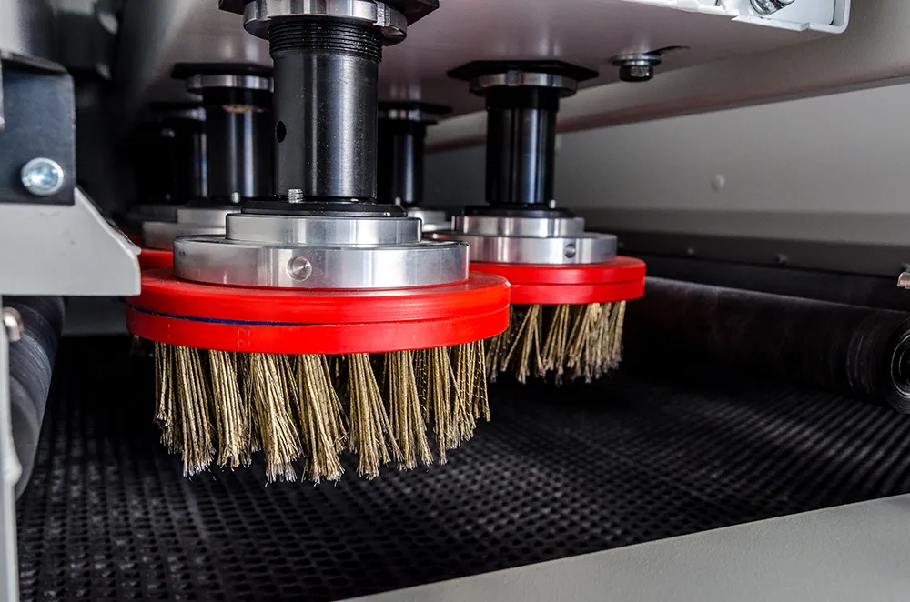 Станок укомплектован тремя рабочими модулями - двумя модулями "R" - бесконечная абразивная лента и модулем "D" - горизонтальные абразивные щетки