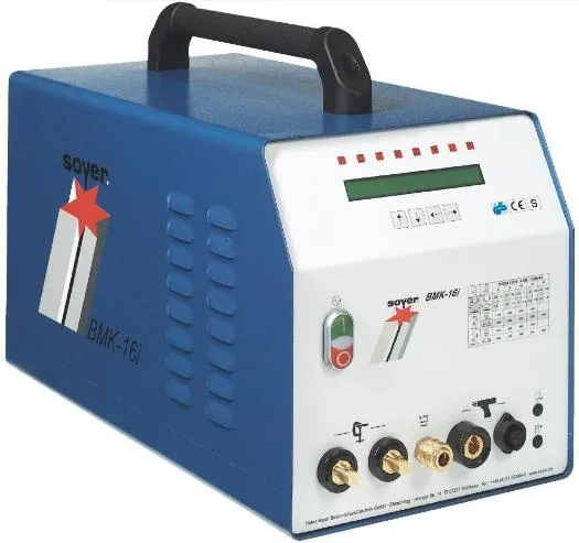 Инвенторный блок питания BMK-16i - многофункциональная высокотехнологичная разработка. В дополнении к возможностям BMK-12W, в данный блок включены следующие технологии: приварка метизов электрической дугой в радиально-симметричном магнитном поле (SRM), что позволяет приваривать нержавеющие гаки, электродная сварка и TIG- сварка, что избавляет от необходимости приобретать отдельные блоки для различных задач. Для работы необходимо подключение электричества 380 Вольт и использование защитного газа или керамических колец.