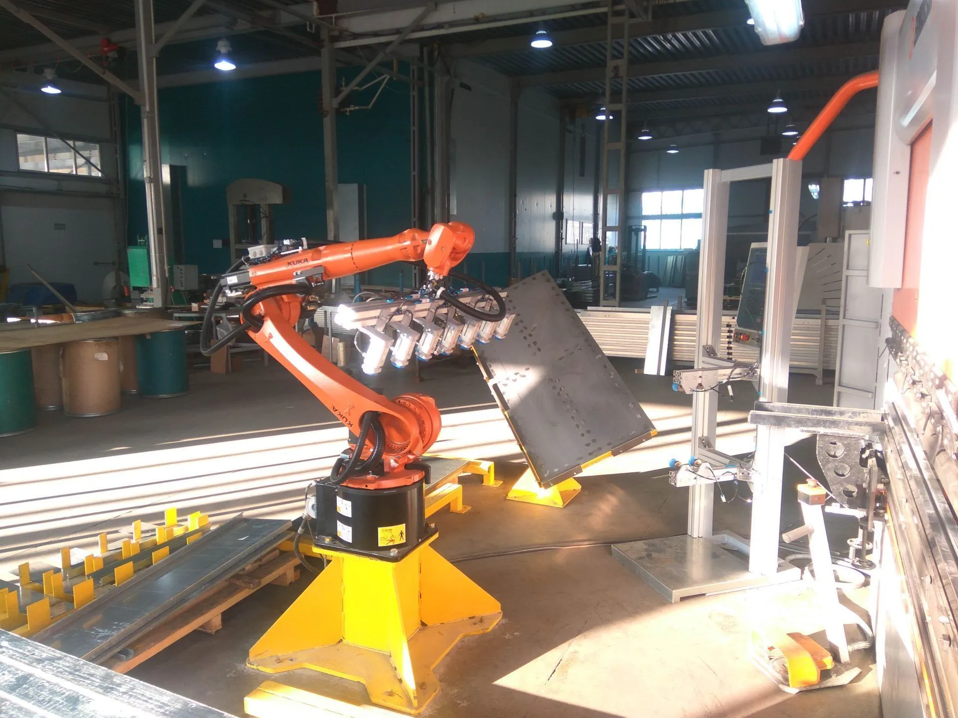 На действующее производство установлен роботизированный комплекс для совместной работы с гибочным станком. Робот-манипулятор производит подачу металлического листа гибочному станку. Робот производит захват заготовок, перемещает их на стол-ориентатор, далее подает гибочному станку, после процесса гибки переносит готовые детали в отдельную стопку.