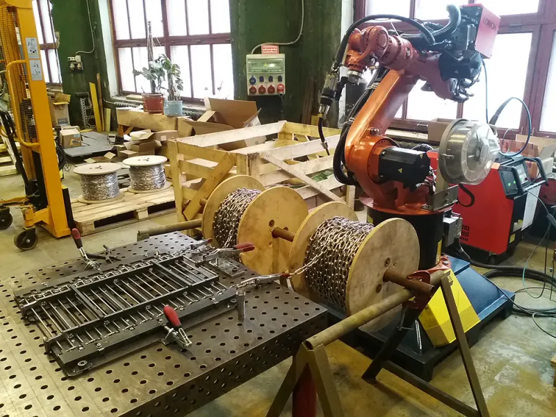 Установлен сварочный робот с ручной оснасткой KR 10 R1420, сварочный аппарат LORCH S3, два рабочих места с оснасткой и ручными зажимами DESTACO.