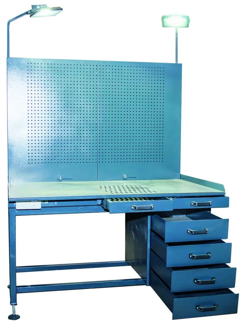 Отвод воздуха осуществляется как через перферацию на самой столешнице, так и через заднюю панель. С помощью специальных задвижек, можно производить регулировку силы всасывания в двух направлениях. На перфорацию задней панели можно дополнительно закреплять: полки, крючки, держатели для инструмента. Шаг перфорации рассчитан на стандартные крючки с межцентровым расстоянием 25 мм.