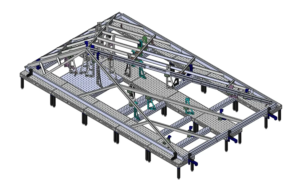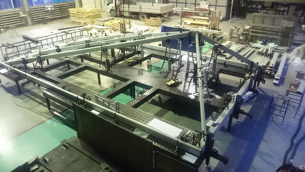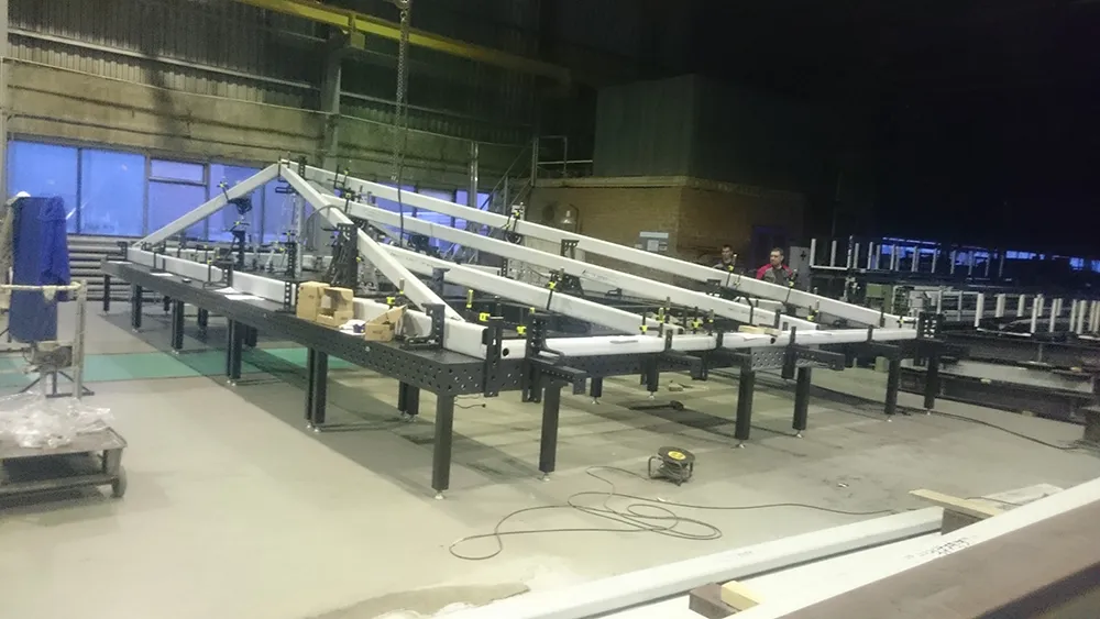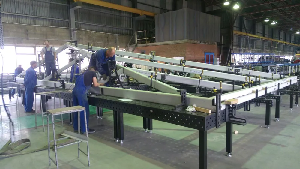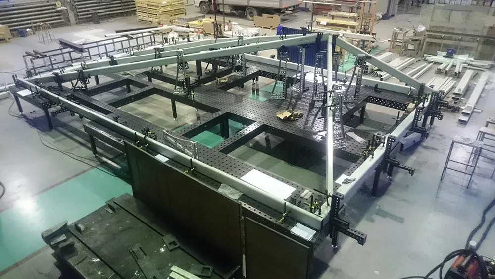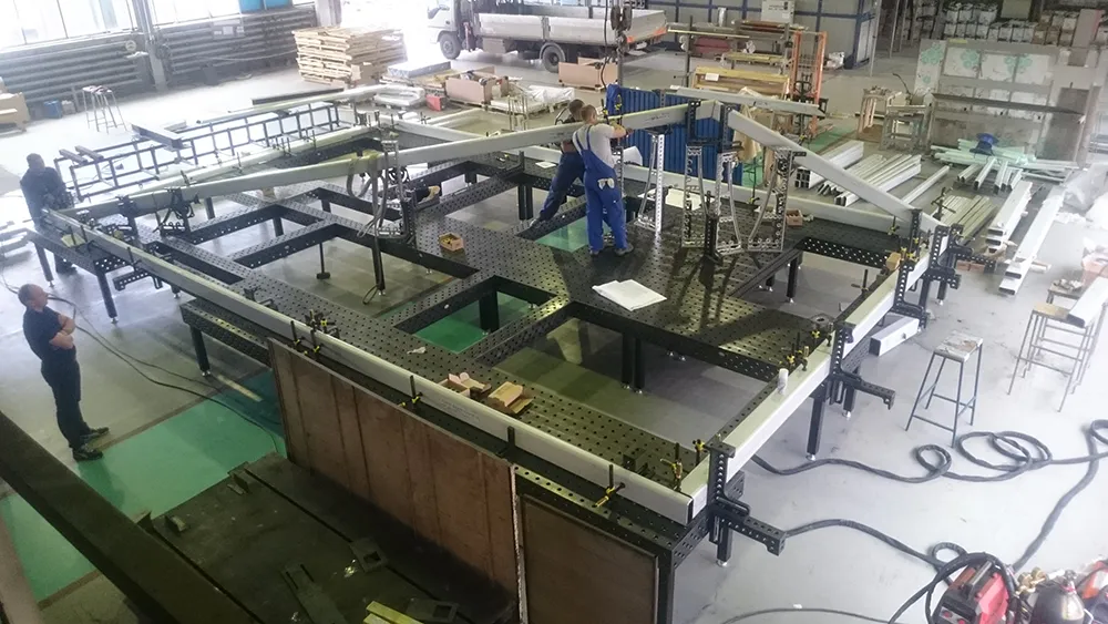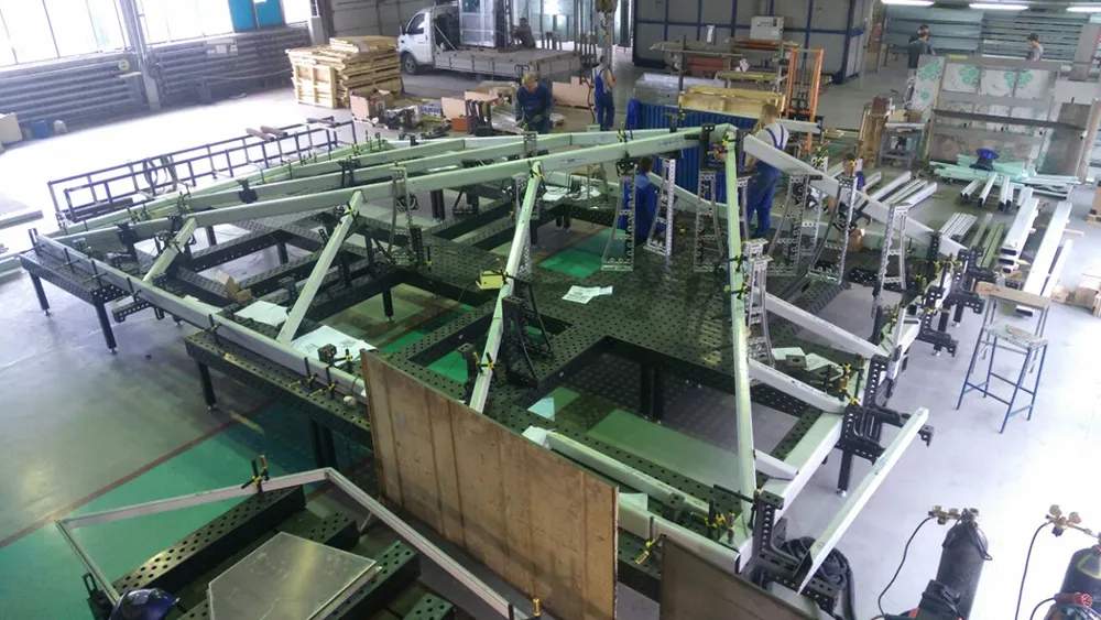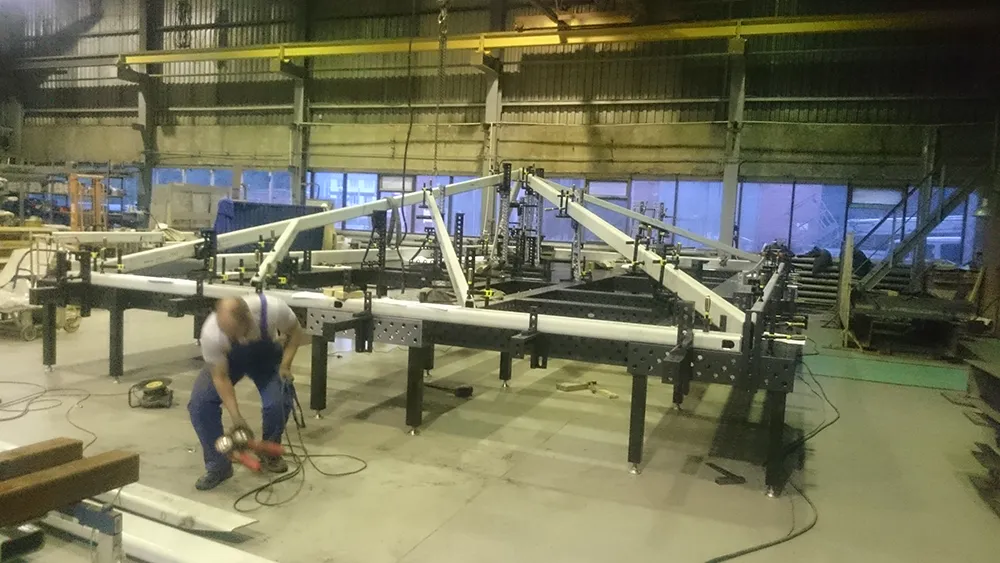Сварка больших металлоконструкций применяемых при строительстве осуществляют на сборочно-сварочных столах Siegmund 28 системы, объединенных в большие стапели, за счет модульной структуры, можно получать рабочее пространство любых размеров, для сборки любых необходимых изделий.